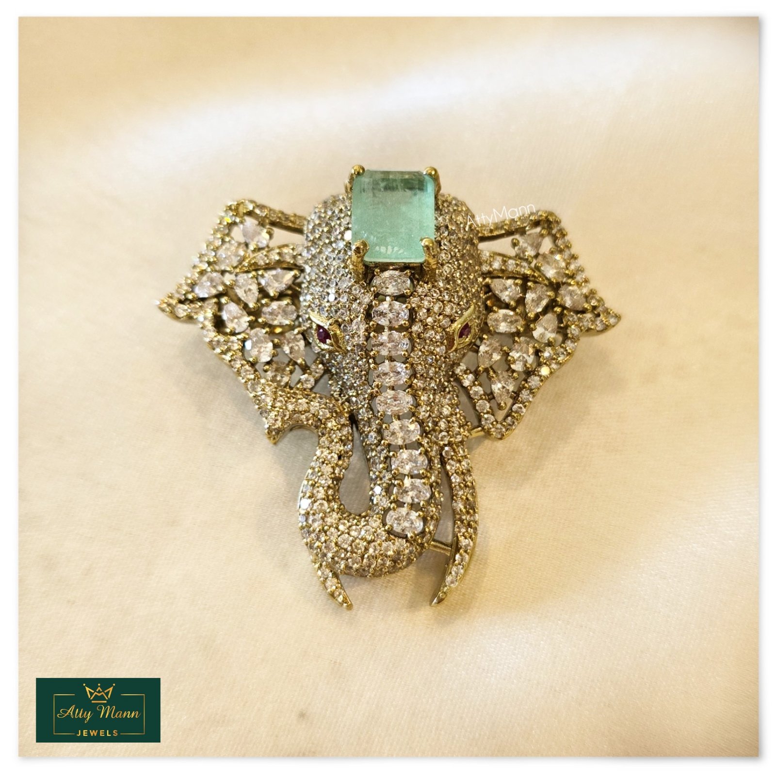 Accented with delicate ruby-toned highlights and gold-polished tusks, the brooch seamlessly blends spiritual symbolism with high-fashion aesthetics. Whether styled on a blazer, silk saree, shawl, or evening jacket, it commands attention while carrying deep cultural meaning.